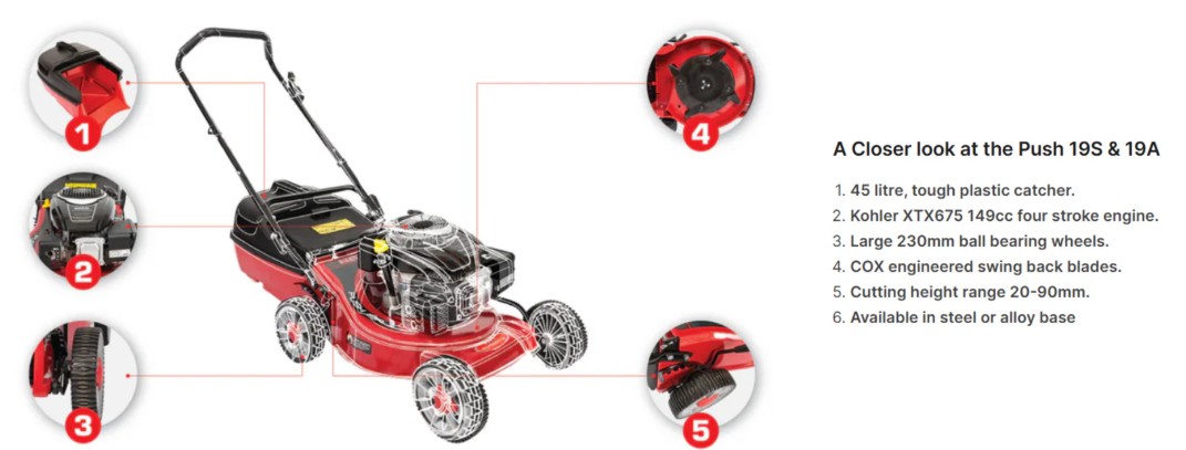 Designed with a steel 19″ (48cm) deck, the COX 19S Push mower delivers unbeatable value and dependable performance. The 19S boasts our legendary COX-engineered swing-back blade system, a harmonious match for Australian lawns of all kinds.
